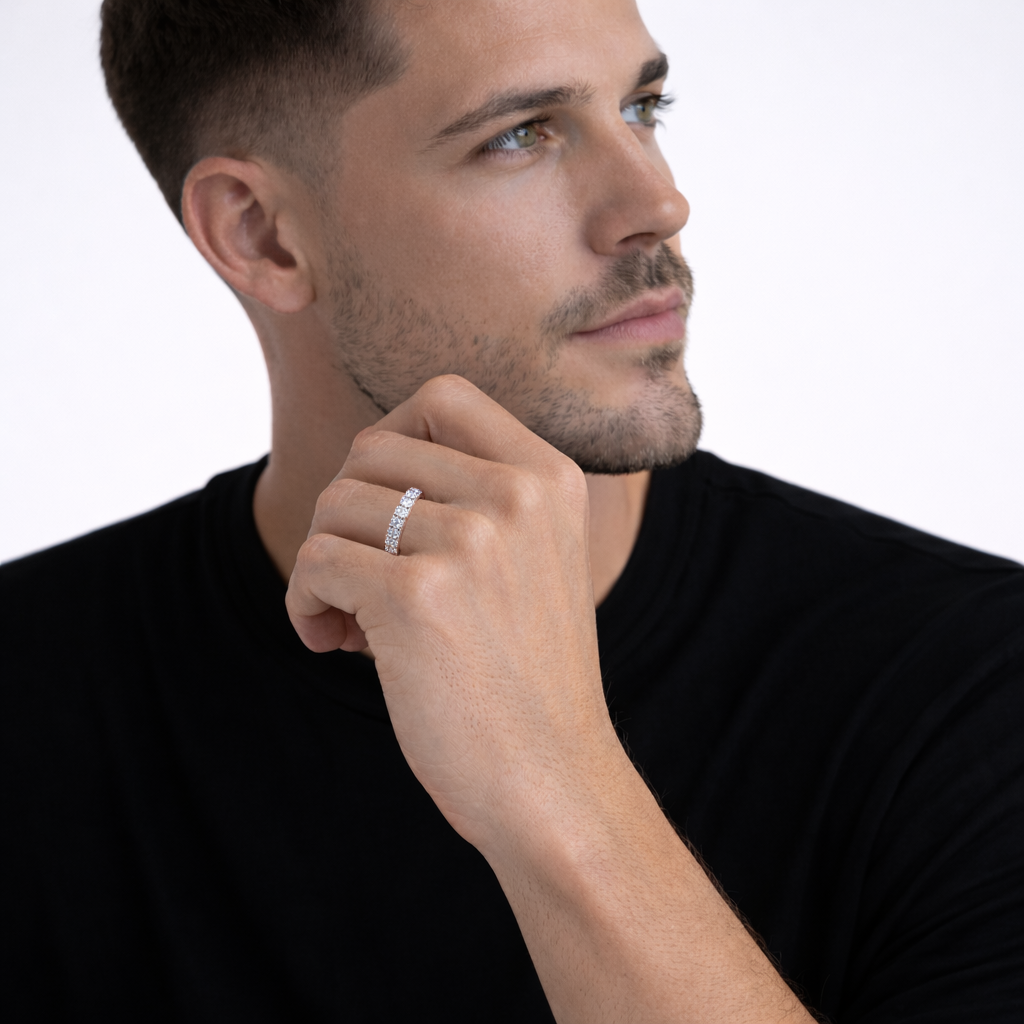 The Aurora Eternity Ring shines with captivating fire and refined sophistication. Each hand-set 5 mm moissanite stone radiates diamond-like brilliance, forming a continuous circle of light that symbolizes endless beauty and grace. Designed for those who appreciate luxury with bold presence, it’s a modern icon of lasting elegance.